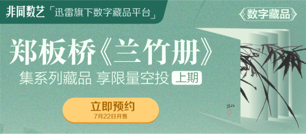 本次《兰竹册》系列藏品共有6款,分别为兰竹、瓶菊、兰竹石、竹石、蒲草、双兰,每款限量出售1000份,用户购买此系列4款及以上,还将获得郑板桥题字的《兰竹册》“金农小诗”空投。本次发售的《兰竹册》系列藏品分为上中下三期,上期为兰竹和瓶菊,于7月22日11时正式发售。目前,预约抽签也已同步开启,用户在预约期间支付预付金参与抽签,中签即可获得藏品。