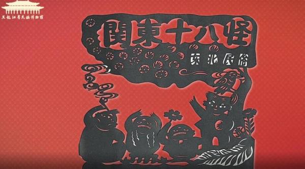 黑龙江省民族博物馆所收藏的是方正县剪纸“关东十八怪”,由黑龙江非物质文化遗产代表性传承人、工艺美术大师陈洪霞制作,并获得2011年第二届中国剪纸艺术节银奖。《关东十八怪》剪纸主题动画,在保持了剪纸原有故事基调及粗线条、大面块、古朴、雄浑的审美氛围的基础上,通过动画的形式,让剪纸里的人物、场景动了起来,让故事“活”了起来,并配以通俗易懂的文字介绍,为原本独具一格的剪纸艺术增添新的韵味,也更通俗、更传神地还原了“关东十八怪”的民俗场景,拉近了大众与艺术作品之间的距离。