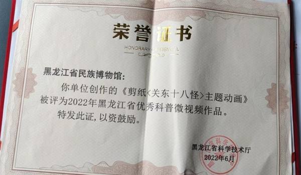 6月底,黑龙江省民族博物馆推出的原创动画——《关东十八怪》剪纸主题动画,被黑龙江省科技厅评定为2022年黑龙江省优秀科普微视频。