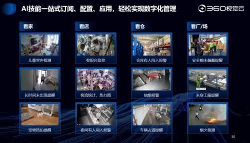 一期360视觉云将围绕中小B的看店、看仓、看厂中的通用场景,上线一系列场景化AI技能,解决中小微企业数字化转型最迫切、最有痛点的需求。