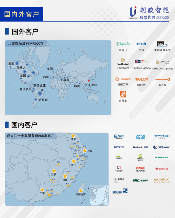 朗骏 成立于1996年,2003年分立上海朗骏机电,专业从事光控开关器件的设计开发和生产制造。2016 年 2 月 14 日实施股改并更名为上海朗骏智能科技股份有限公司, 2016 年 5 月 30 日于全国中小企业股份转让系统即“新三板”挂牌,股票代码 837588。浙江朗骏电子科技有限公司是上海朗骏智能科技股份有限公司的全资子公司,上海朗骏智能成立已经二十年,是专业研发生产智能光控器的企业,目前是该行业的世界领军企业,已经在新三板挂牌。