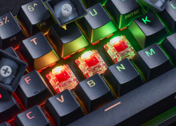 一般的RGB键盘亮度普遍不高,夜晚尚且可以,一旦到了白天就黯然失色,这有多方面因素,LED灯泡亮度不够、光源散发不顺畅,设计不合理等等。HyperX起源65游戏机械键盘则双管齐下,巧妙的采用外露式LED搭配悬浮式键帽设计,让光源的散发更通透,如此一来,灯光效果更加璀璨夺目,即便是光线充足的白天也可以熠熠生辉。