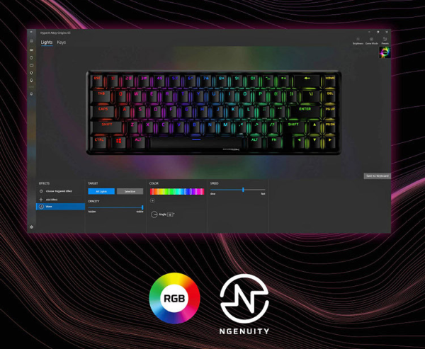 HyperX起源65游戏机械键盘拥有多种预设光效,玩家可以根据环境光线对亮度进行5档调节,特别是环境幽暗的夜晚,只需要低亮度就可散发酷炫光效。
