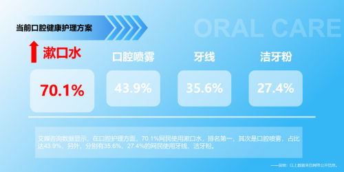 所以相比口香糖,现在更多人愿意使用漱口水。艾媒咨询数据显示,在口腔护理方面,70.1%网民使用漱口水,排名第一,其次是口腔喷雾,占比达43.9%,另外,分别有35.6%、27.4%的网民使用牙线、洁牙粉。