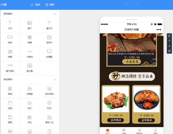 步骤六,到这一步我们在微信小程序上添加商品的步骤就完成了,最后到店铺-我的模版-站点设计,选择一个适合我们的小程序模版,然后可以对模版进行自定义修改和添加内容,然后商品我们可以直接添加到首添加商品的过程其实也是页或者二级页面,最后保存发布就可以了,添加商品的过程也是制作商城小程序的过程,商品添加完成我们的商城小程序也就完成了,接下来就是装修我们的小程序页面了。