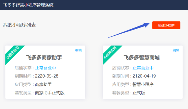 步骤一,微信小程序本身是不具备添加商品和开店功能的,所以我们需要用微信小程序开发平台,这边我们可以用飞多多智慧小程序(https://xcx.feidodo.com),注册之后绑定我们的小程序就可以开始添加商品了。