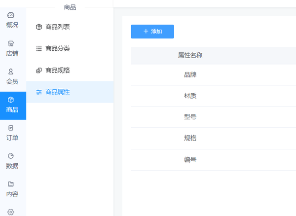 步骤二,点击我们的小程序名称就可以进入后台,左侧-商品,在打开商品栏目,我们先添加商品属性,打开商品属性,我们可以添加产品的参数,比如材质、规格、等级、材质、颜色、风格、大小、尺码、季节的词等等。