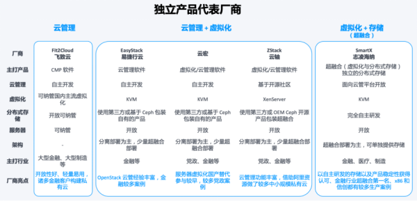 易捷行云的云管理基于 OpenStack,云管经验比较丰富,也有较多的金融案例。云宏是较早参与到服务器虚拟化国产替代的厂商,有较多的党政案例。云轴的云管理是基于开源社区,功能丰富,且借助阿里资源落地了较多中小规模私有云。但以上这些厂商都没有自主的分布式存储产品。
