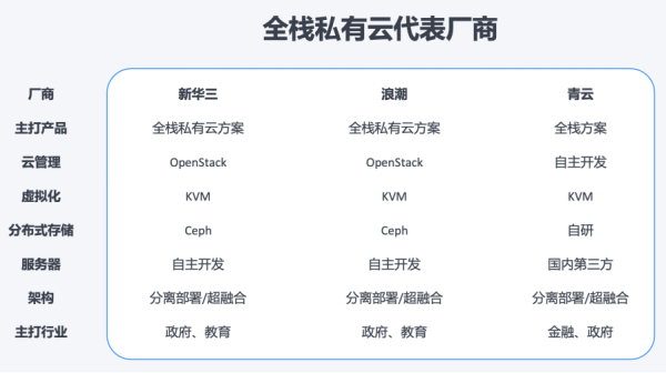 不同与以互联网公有云为核心基因的专属云,新华三、浪潮、青云等厂商都提供私有云技术路线的全栈云,但各自在不同组件上的侧重也有所不同。新华三和浪潮都以 OpenStack 作为云管理,基于 KVM 提供虚拟化,基于 Ceph 提供分布式存储,自主开发服务器,整体架构即可分离部署,也支持超融合部署。青云则是自主开发的云管理,基于 KVM 提供虚拟化,自研分布式存储,基于国内第三方提供服务器,架构部署为分离部署和超融合。关于 OpenStack 与 Ceph 等开源组件的问题,在前面技术路线内容中已有解释,这里不再赘述。