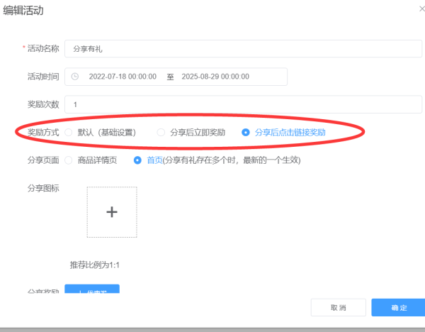 步骤二,应用-营销-分享有礼,进入分享有礼活动页面开启功能状态之后,活动管理中点添加,先编辑活动名称,比如店铺周年庆活动分享有好礼,然后是勾选活动时间,奖励次数和奖励方式,为了有更好的效果我们建议是勾选分享后点击链接才可以获取奖励,商家可以自定义勾选。