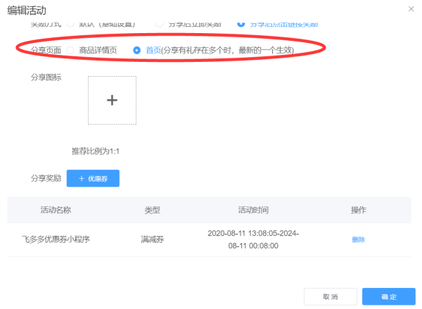 步骤三,分享页面勾选,分为商品详情页和首页,如果选商品页的话就需要勾选商品,可以添加多个商品,勾选首页的话,我们只要上传一个分享图片,就可以了,分享奖励勾选优惠券,优惠券也是我们需要提前添加好,这里就可以直接选,最后确定就可以保存了。