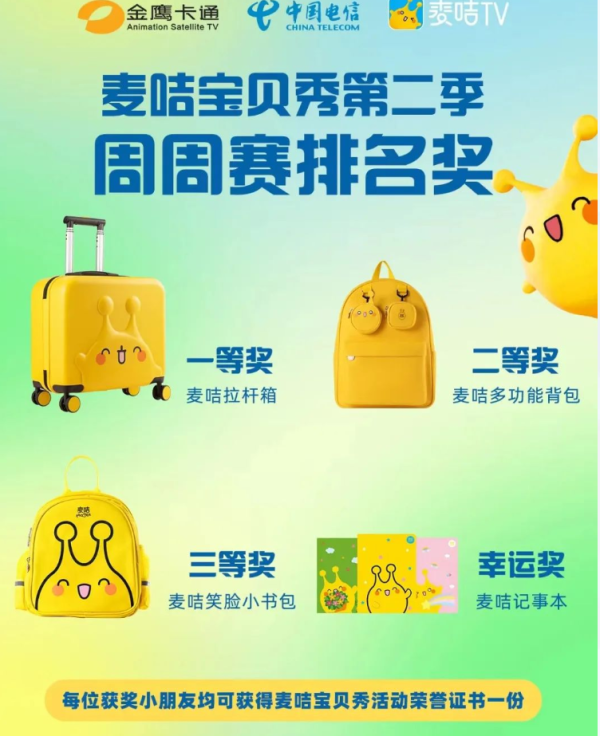 由湖南电信和金鹰卡通联手举办的“麦咭宝贝秀第二季”,接受各种形式的参赛视频,门槛更低,奖品更丰富,已经有超多小朋友报名参加了!”湖南省内所有爱秀的小朋友,都有机会登上金鹰卡通和麦咭TV的舞台,在麦咭的陪伴下度过一个充满惊喜的暑假。