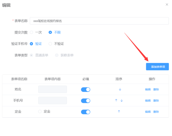 步骤三,添加表单项,编辑名称,比如姓名,然后是勾选类型,姓名的类型就是单行文本,继续添加表单项,联系方式,就勾选类型是手机号,如果需要添加时间,就继续添加课程报名时间选择,选日期时间,最后如果本次课程报名需要支付报名费用,我们就可以勾选支付,编辑价格,确认就可以了。