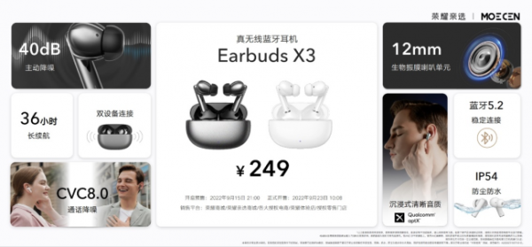荣耀亲选 Moecen Earbuds X3真无线蓝牙耳机9月15日21:00正式预售,9月23日 10:08正式开售,249元的定价也在同类主动降噪耳机中极具优势,诚意满满,感兴趣的朋友们赶快入手吧!