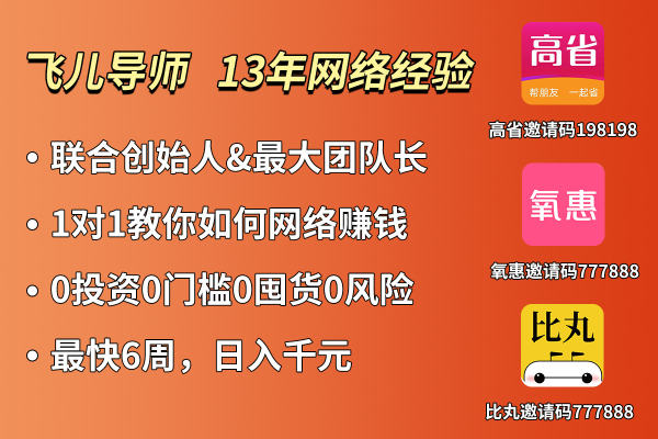本文作者:联合创始人&最大团队长飞儿导师,13年网络经验,高省邀请码198198,氧惠/比丸邀请码777888,用此邀请码注册,免费送精准引流技术+百度霸屏技术,1对1扶持助你打造百万团队!