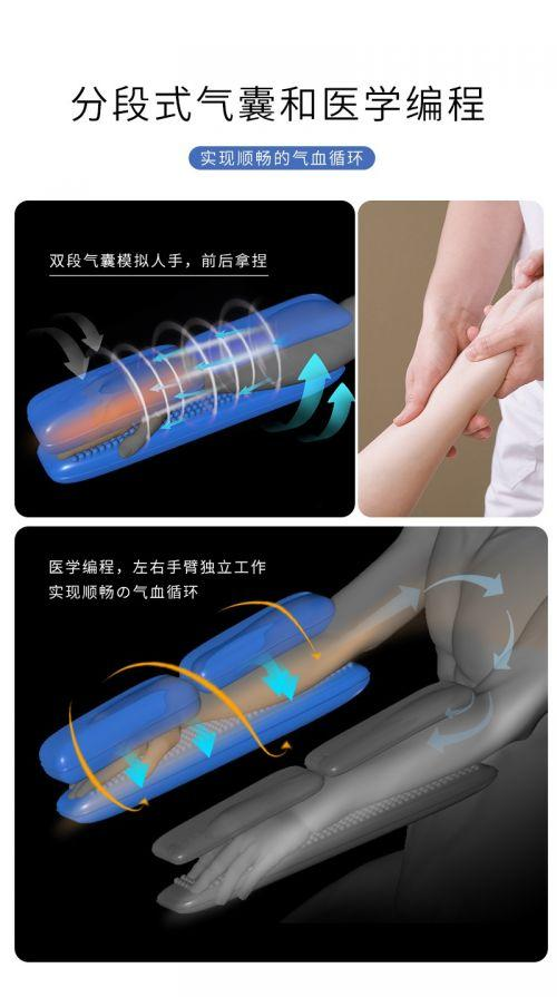 M Ergo臀部三段气囊采用波浪式瑜伽气囊智慧模块,仿日式瑜伽以带动要不做扭转运动塑形,可极大缓解腰臀僵硬不适。分段式气囊系统则可实现向心离心医学程式,也展现出更具创新性的技术。分段式气囊系统在全身多部使用多路独立控制单元,前臂至多可达六路、腿足4路等。更细致的气囊独立控制配合背部机芯,忠实再现按 摩师多彩技法。还可根据多路独立控制单元组件达到夹捏挤压按 摩的独立控制,实现精细化局部按 摩,更能完美实现科学的程序设计。