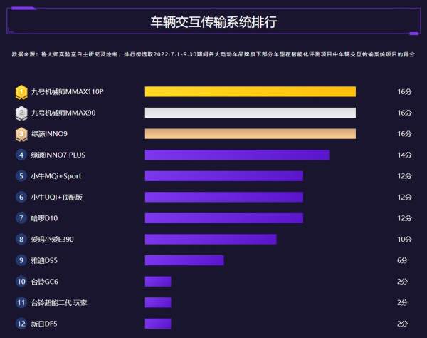 鲁大 师2022年Q3季报正式发布,本次季报包含电动车智能排行,测试的车型为市面上主流品牌的主流车型,共计12款,全部按照评测维度更广、更专业的鲁大 师电动车智慧评测2.0进行评分,测试的成绩均来自于鲁大 师智慧硬件实验室。