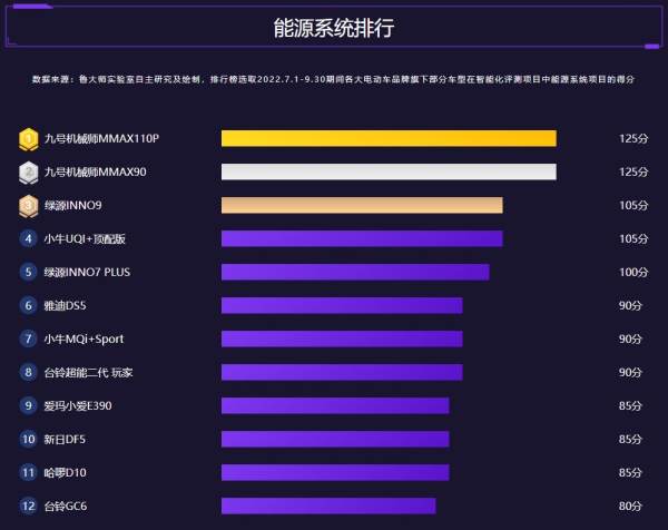 电动车能源系统排行根据电动车智能状态当中的电池容量、充电时间、电池保护系统、能量回收系统以及外沿拓展能力实验室考核评分。