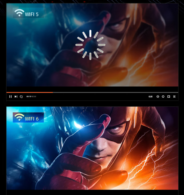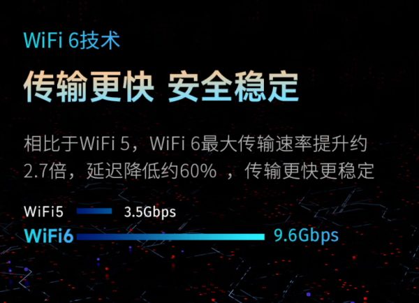 于是随着用户需求的升级,Wi-Fi 6应运而生了,WIFI6,即第六代无线网络技术,是一种Wi-Fi标准的名称,它是Wi-Fi联盟创建于IEEE 802.11标准的无线局域网技术,Wi-Fi 6允许与多达8个设备通信,最高速率可达9.6Gbps。相比于目前常见的wifi5技术,wifi6在传输速率,接入数量,能耗降低都有着更好的表现。在日常表现测试中,传统wifi5传输数据大致能达到500mbps左右,而wifi6则能大致达到800mbps左右,提升近50%。