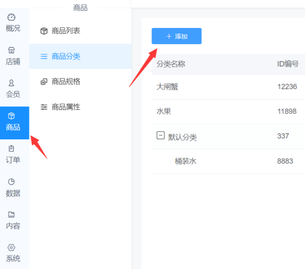 步骤二,首先我们的便利店小程序需要添加商品,我们可以在后台,点开商品,然后我们可以看到商品列表、商品分类、商品规格、商品属性,我们先添加商品分类,我们可以根据我们便利店里在售商品的分类进行添加,比如食品、饮料、纸巾、熟食等。