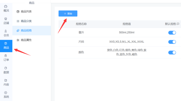 步骤三,商品分类添加完成之后就可以继续添加商品规格和属性,比如饮料有不同的毫升,纸巾有不同的尺寸等,添加完成就可以到商品列表中添加商品了。