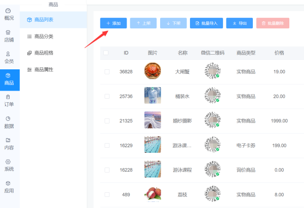 步骤四,商品列表,我们可以一个一个添加商品,也可以批量导入商品,如果我们是点添加按钮的话,弹出来的对话框中我们需要把带星号的内容填写好,比如商品名称、分类、价格、库存、图片、规格、属性、详情介绍,填写完成之后在其他设置中要勾选配送方式,还可以在这部分设置会员价格,最后保存即可。