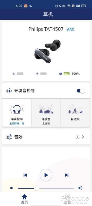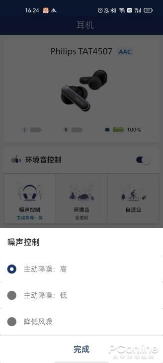 飞利浦T4507最大的亮点便是ANC混合降噪技术,左右耳各有一个前馈麦克风和后馈麦克风,共4个麦克风配置,结合Philips Headphones专用app,可以实现多种人性化的降噪处理,包括高降噪、低降噪和降低风噪,还可以根据自身行动状态选择智能调节的“自适应模式”。