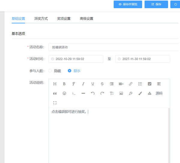 步骤二,应用-营销-抢福袋-开启功能状态之后点添加,我们就可以进入抢福袋抽奖活动的编辑页面,左侧是可视化的编辑,右侧是我们需要设置的地方,基础设置中先把活动名称、活动时间、活动说明和高级选项编辑完成。