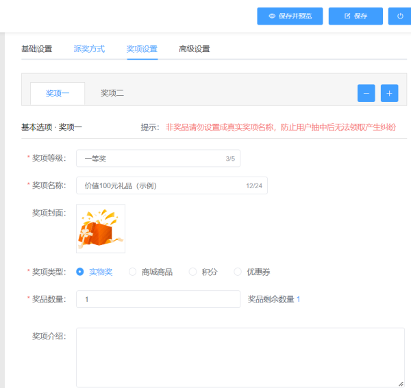 步骤三,派奖方式中设置抽奖机会和中奖概率;奖项设置中添加我们的奖品信息,包括奖品名称、奖品类型、奖品数量、奖品介绍和兑奖方式。