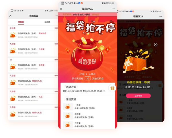 抢福袋抽奖小程序的活动,可以帮助我们商家打造更加多样化的互动营销活动,进一步增强商家通过营销活动获取新客户、激活老客户的能力。通过实物、积分、商品、优惠券等多样的奖品支持,帮助商家通过营销活动创造更大的价值,带动会员线下领取实物、线上消费积分,增加商城商品曝光度、提升商品销量,活动形式多样化使用更灵活支持微信小程序和公众号同时发布,扩大受众群体覆盖,抽奖活动模版多多,抽奖活动好处多多,感兴趣的小伙伴赶快动手注册体验吧。