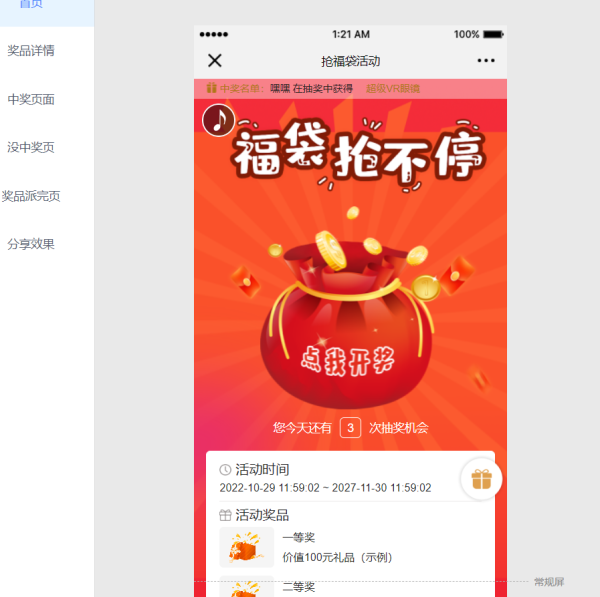 抽奖活动从上线到现在都是作为一种运营的方式,一直活跃在我们的微信里边,现在无论是线下门店还是线上商城,都会选择使用抽奖活动作为我们拉新、促销、获客的活动方式之一,抽奖活动适用的行业也非常多,几乎是不限制行业的,特别适合餐饮、零售、娱乐、运动、美业、生鲜等门店,抽奖活动我们都是可以设置奖品和中奖概率,现成的模版直接套用,中奖记录和参与记录实时更新,特别适合新手商家做店内营销活动,那么抢福袋作为抽奖活动模版之一,要怎么做呢,我们可以使用微信小程序开发的抢福袋模版轻松实现抽奖活动。