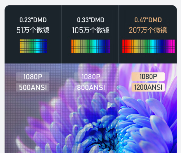 从上面的表格中,我们可以看到,在3000元价格段里,比较有优势的是中间的大眼橙NewX7D,相对来说,音画参数就相对要高一些,特别是大眼橙NewX7D配置的DMD芯片,是0.47″DMD的,极米NEWZ8X和坚果O1S的DM的芯片,则是0.33″DMD和0.23″DMD的芯片。DLP投影仪的表现最核心的就是看这个DMD的芯片配置,可以说是投影仪的底层架构,在这个基础上各家品牌会去增减其他功能,来实现产品之间的功能的差异,从这个角度对比,大眼橙NewX7D就要更好一些,这个优势体现在画面分辨率上,0.47DMD带来的是全高清的1080P原生分辨率,0.33DM的原生分辨率是720P,0.23DMD的原生分辨率是480P。
