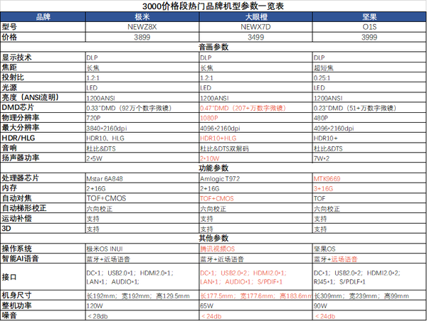 其实选择投影仪很简单,有时候真的就是看着复杂,其实只要抓主要矛盾,就能解决大部分的问题,看下图,列的就是三千元价格段比较热门并且有特点的三款投影仪:极米NEWZ8X,大眼橙NewX7D和坚果O1S,把他们的主要参数和使用中经常会用到的功能列在一起,对比参照,就可以一眼看出哪款不错哪款更值得买了。