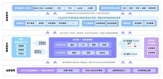 目前打造的由「无代码」、「轻析」、「轻代码」、「QMC管理套件」组成的 All-in-One 应用开发平台,将“圆桌式开发”协作理念融入系统搭建实践中,赋能IT、业务管理者、数据分析师、信息化架构师等不同企业角色。