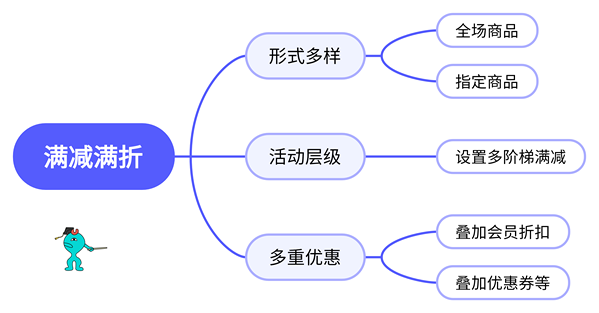 满减满折是大促中常见的营销玩法,通过设置多阶梯满减满折优惠,引导客户为了达到满减的最低费用标准而提高客单价,适用服饰、百货食品等行业商家的促销场景