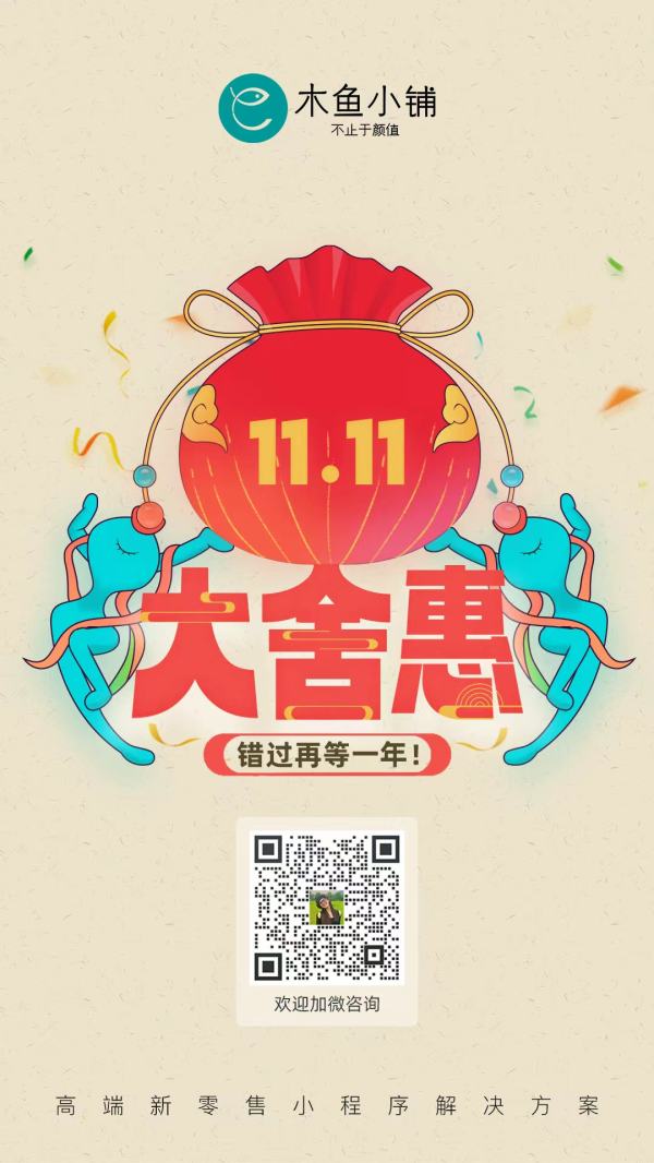 以上就是备战双十一的营销建议啦!现在你做好大促准备了吗?你的小程序商城具备以上促销能力吗?木鱼小铺双十一活动开始啦,一年只有一次的钜惠福利,具体优惠请扫码咨询。