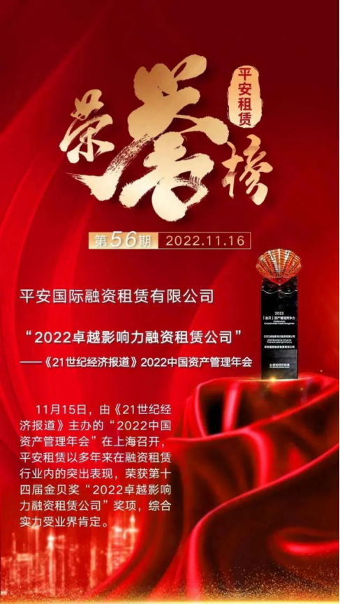 11月15日,由《21世纪经济报道》主办的“2022中国资产管理年会”在上海召开,平安租赁以多年来在融资租赁行业内的突出表现,荣获第十四届金贝奖“2022卓越影响力融资租赁公司”奖项, 综合实力受业界肯定。