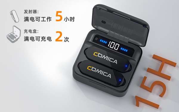 在直播、短视频、播客等创作形式爆热的今天,续航能力成为消费者选择麦克风的关键因素。科唛Vimo S 的充电仓除了可以收纳设备以外,还能为发射器提供三次循环充电,单次发射器续航可长达5小时,接收器无需单独供电,户外拍摄或长时间直播也无需担心电量问题。在充电仓表面还配备数显及指示灯设计,精准显示充电仓与发射器的电量存余,帮助创作者实时掌控麦克风电量状态。