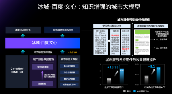 据介绍,冰城-百度·文心大模型将城市中跨业务、跨结构、跨部门的数据知识和多种任务算法进行融合,基于百度文心NLP大模型ERNIE 3.0,打造统一预训练模型,提供超强的语言理解、语义分析等能力,支撑城市各领域AI规模化应用的开发效率和效果的提升。