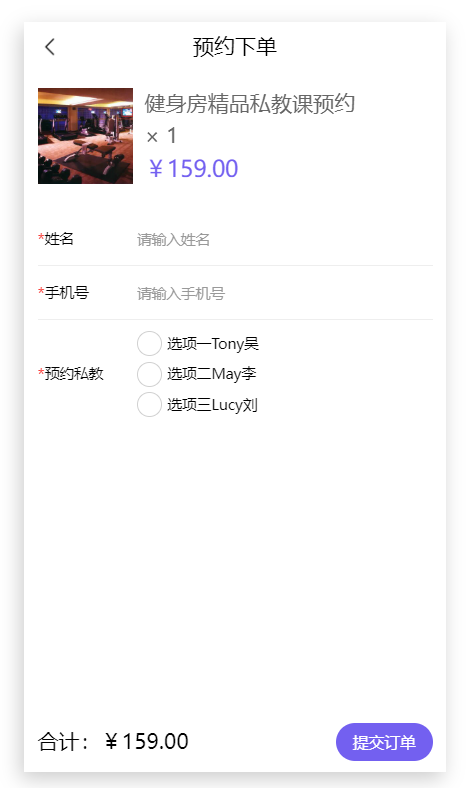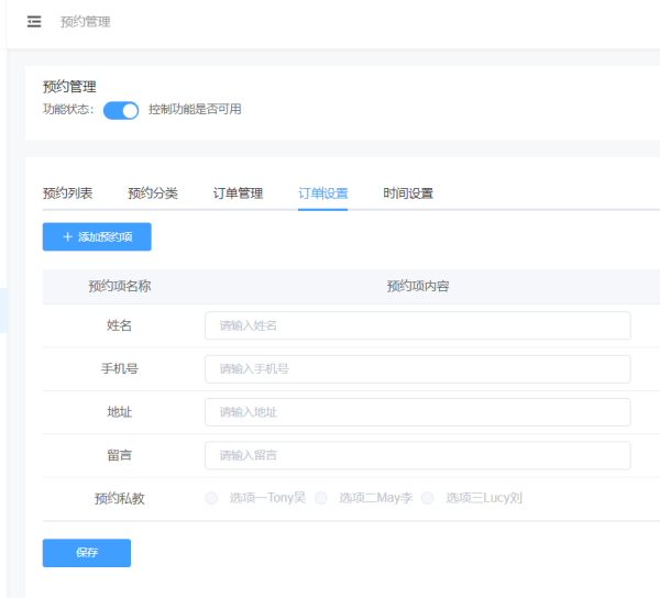 步骤三,订单设置中可以添加我们需要用户在预约课程的时候需要留下什么信息,比如预约人名称、联系方式、预约时间、预约教练、预约课程等。