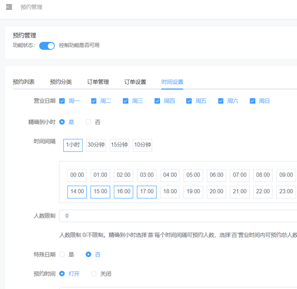 步骤四,时间设置,这个就是我们的健身房微信小程序中预约的时间设置,也是我们课程的时间,我们可以精确到小时,然后是设置时间间隔、人数限制、特殊日期等。