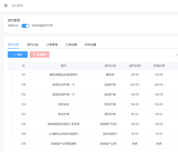 步骤五,预约列表-添加,填写我们预约课程的名称、描述、图片、分类、价格、时间和详细内容就可以保存继续添加其他预约课程了。