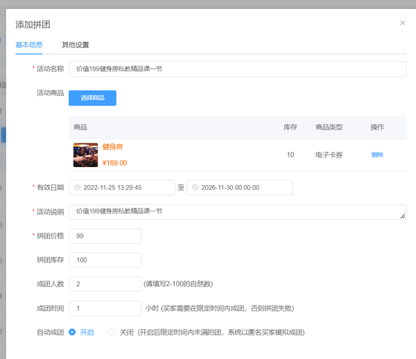 步骤四,应用-营销-拼团,在健身房微信小程序中拼团拼课活动非常多见,很多商家都会选择拼团的模式让客户拼单购买课程,拼单人数越多享受折扣越低,对商家做引流获客效果不错。