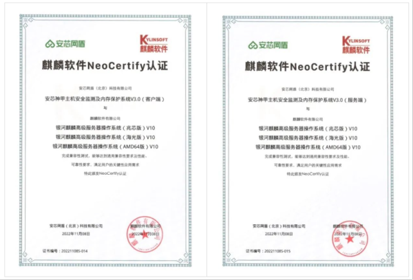 近日,安芯网盾拳头产品“安芯神甲主机安全监测及内存保护系统V3.0获得麒麟软件NeoCertify认证。通过严格的共同兼容性测试表明:安芯神甲能够达到通用兼容性要求及性能、可靠性要求,并满足用户的关键性应用需求。