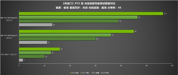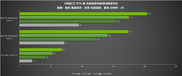因使用了路径光线追踪的缘故,在游戏中对于GPU的消耗是十分巨大的。可以看出在2K分辨率下,RTX 3080 Ti在不开启DLSS 2的情况下只有20FPS,而在开启DLSS 2 后帧数有明显的提升,在性能模式下能跑到68FPS。开启DLSS 3 后RTX 4080 和RTX 4090 均有不错的性能提升。性能模式下都有170+和200+以上的帧数,达到完美运行游戏的标准。
