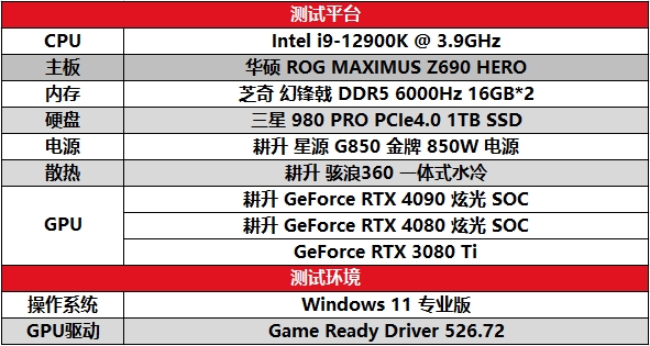 本次测试采用的是 GeForce RTX 3080 Ti、耕升 GeForce RTX 4080 炫光SOC以及 耕升 GeForce RTX 4090 炫光,以此来测试不同GPU下游戏性能的差异和Reflex数据对比。
