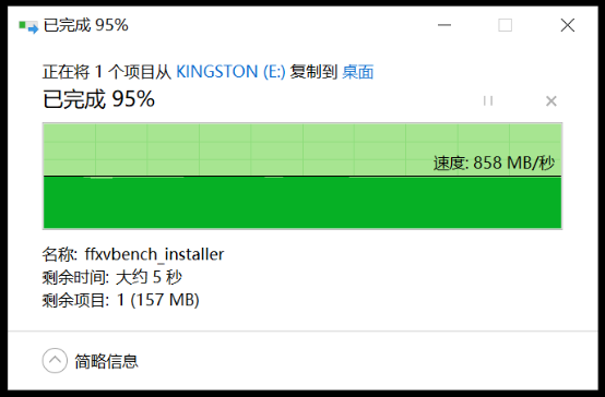 通过简单的日常应用就可以对金士顿DTMAXA闪存盘有一个全面的了解,比如将一个3.66GB的文件从金士顿DTMAXA闪存盘复制到桌面,实测读取速度在852-867MB/s之间,仅需4-5秒就完成了大容量数据的复制。倘若依然用老旧的USB2.0闪存盘,复制需要的时间恐怕20分钟以上,效率差距天壤之别。