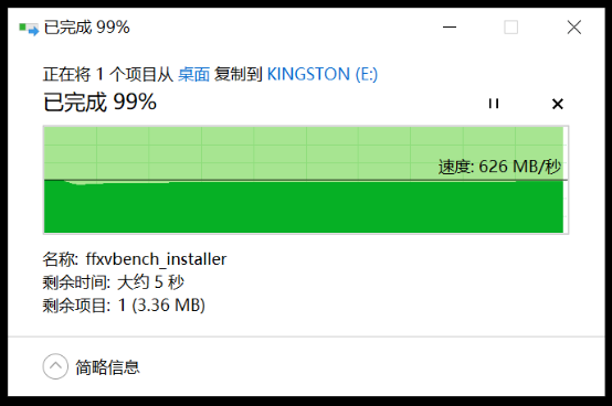 同一个文件,从桌面复制到金士顿DTMAXA闪存盘中,其实测写入速度在623-628MB/s之间,只需要5-6秒就可以完成写入操作。如果是老旧的USB2.0闪存盘,这个复制时间恐怕要30分钟以上,甚至更长。