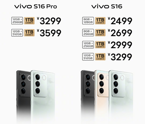 vivo S16 Pro则提供了2个版本,12+256GB版售价3299元,12+512GB版售价3599元。