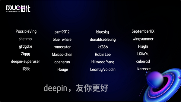 会上,deepin深度爱好者代表PossibleVing、木一明、gfdgd xi,以及意大利朋友Bolsimone、法国朋友David和罗马尼亚朋友Octavian为本次大会送上了真挚的祝福,并表示将与deepin一同进化、共同成长。